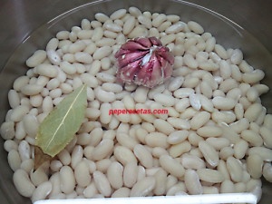 - Preparar una olla o cacerola con 1,5 litros de agua con 2 cucharaditas de sal, añadir en frío las judías que previamente habremos tenido en remojo desde la noche anterior, la cabeza de ajo, el laurel, y poner a cocer a fuego fuerte al principio y luego bajar a fuego lento. Espumar. Si se requiere hacerlas rápidas cerrar la olla express y se harán en 15' dependiendo del tipo de olla. Cuando estén pasar a una cacerola o fuente de barro con caldo suficiente para añadir y terminar de cocer con el resto de ingredientes.